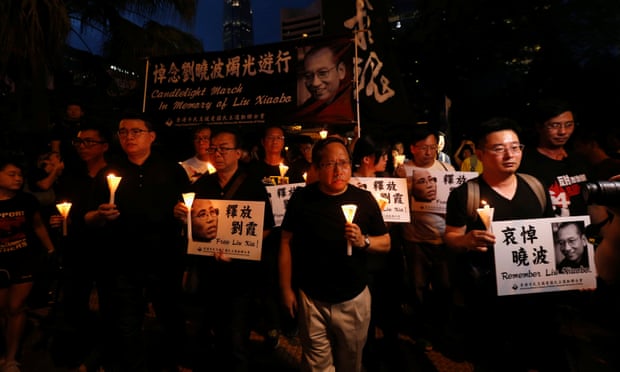 Thousands of mourners in Hong Kong hold a march in honor of Liu Xiaobo. (Photo courtesy of the Guardian)